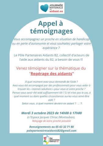 Nous lançons un appel auprès des aidants du Tarn et Garonne et les invitons à nous rejoindre lors de cette après-midi pour qu’ils témoignent et apportent leur éclairage en lien avec :