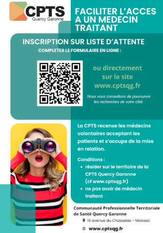 La CPTS Quercy-Garonne a mis en place une liste d'attente accessible via son site Internet : https://www.cptsqg.fr/actions/recherche-de-medecin-traitant.html